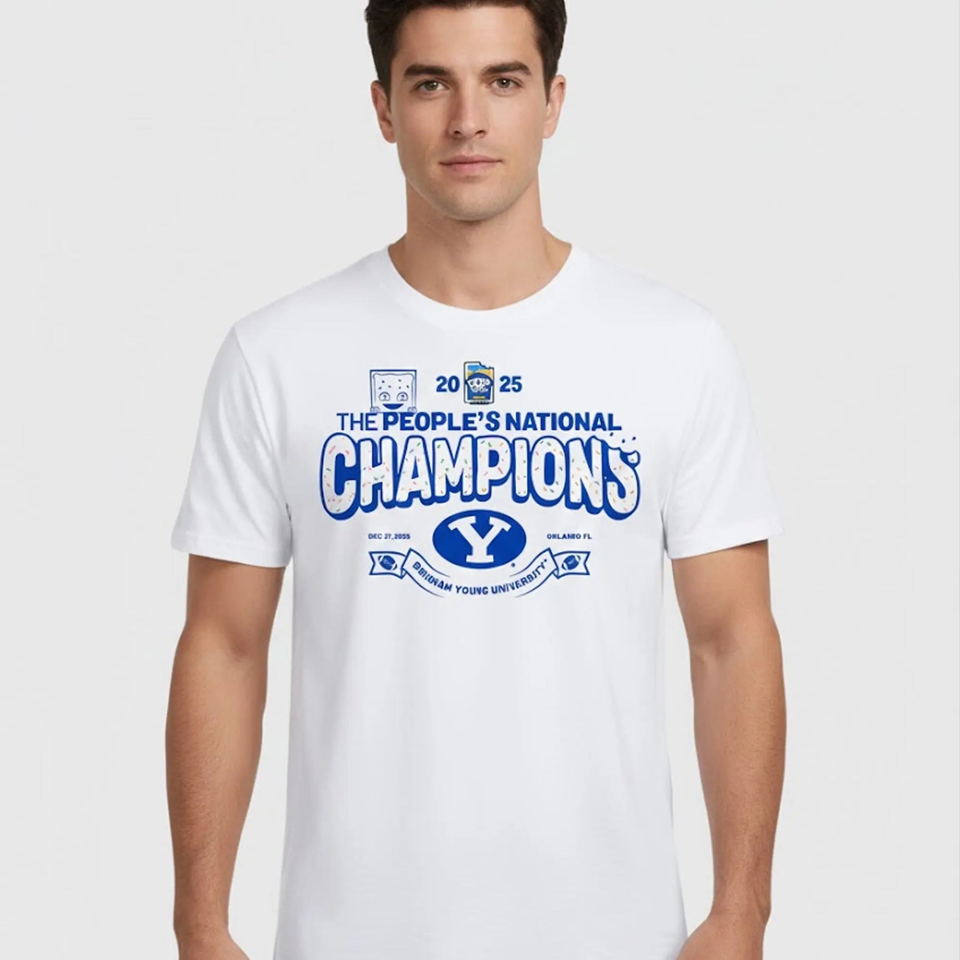 This shirt features a clean white base with bold royal-blue graphics, including the smiling Pop-Tarts mascot, the official bowl logo, the year 2025, and a large “CHAMPIONS” wordmark wrapped around the classic BYU “Y” logo and the game date in Orlando, Florida. This design celebrates BYU’s dramatic victory and turns the fun, fan-created idea of a “People’s National Championship” into something tangible that unites students, alumni, and casual viewers in a lighthearted, positive way. The shirt went viral because it perfectly captures the playful spirit of the Pop-Tarts Bowl, the edible mascot moment, and the social-media joke that this quirky bowl is the true championship, making it instantly shareable, meme-friendly, and a must-have symbol of joy and togetherness in college football culture.