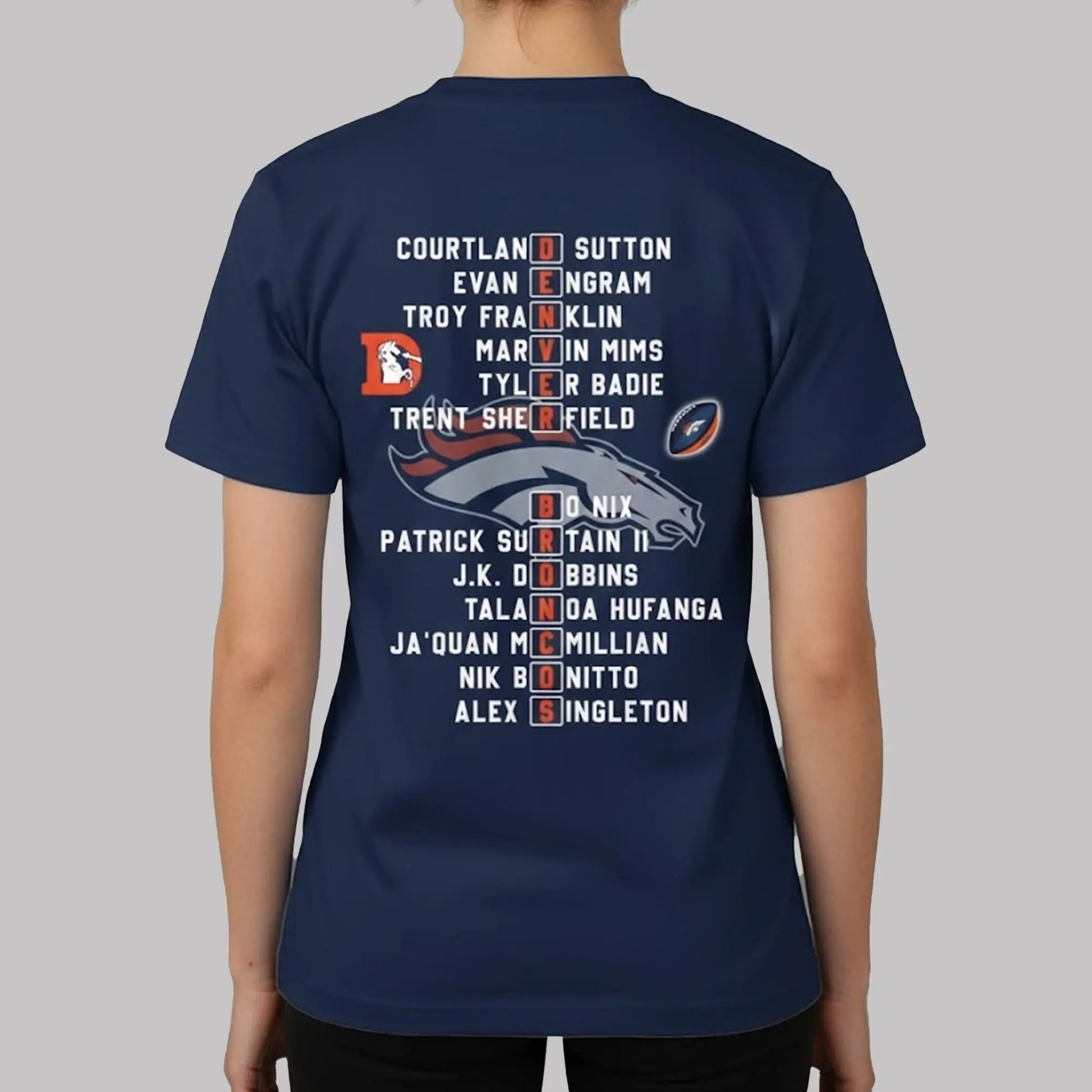 The Denver Broncos 2025 AFC West Division Champions Shirt is a premium navy tee that masterfully captures the team's triumphant 13-3 season, featuring a bold orange badge with the iconic horse logo, a timeline of key years from 2020-2025, and star player names like Bo Nix, Courtland Sutton, Evan Engram, J.K. Dobbins, and Trent Sherfield on the back. Its vintage-inspired design with gleaming accents and tagless neckline ensures durability for game days, tailgates, or casual wear. This shirt symbolizes unyielding fan pride and resilience, celebrating the Broncos' first division title since 2015 as a beacon of hope, unity, and renewed glory for Broncos Country, inspiring wearers to embrace victory and rally toward Super Bowl dreams.