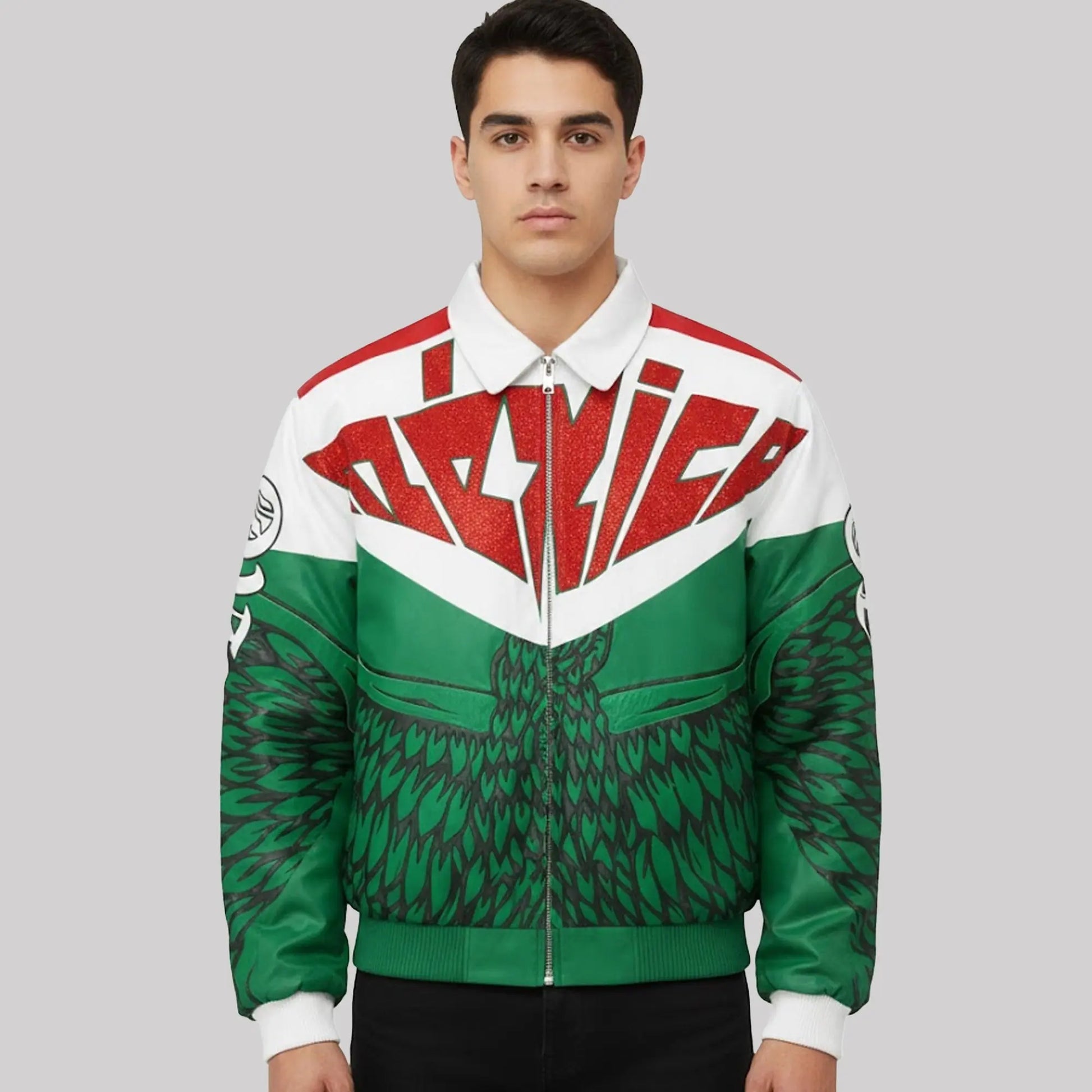 When J Balvin wears this Mexico Virgin of Guadalupe jacket, the piece becomes more than bold streetwear – it turns into a moving celebration of culture, faith, and identity. The vivid red, white, and green panels echo the Mexican flag, while the powerful image of the Virgin of Guadalupe and roses on the back reflects hope, protection, and spiritual strength. The sharp “Mexico” script and feather‑like details across the front add energy and movement, matching his vibrant musical style and stage presence. By choosing this jacket for his post, J Balvin sends a positive message of pride and unity, showing love for Mexican fans and respect for the traditions that inspire Latin music. The connection between him and the jacket feels natural: just as his songs blend global sounds with Latin roots, this jacket blends modern fashion with deep cultural symbolism, reminding people that success is even more meaningful when you stay true to where you come from.