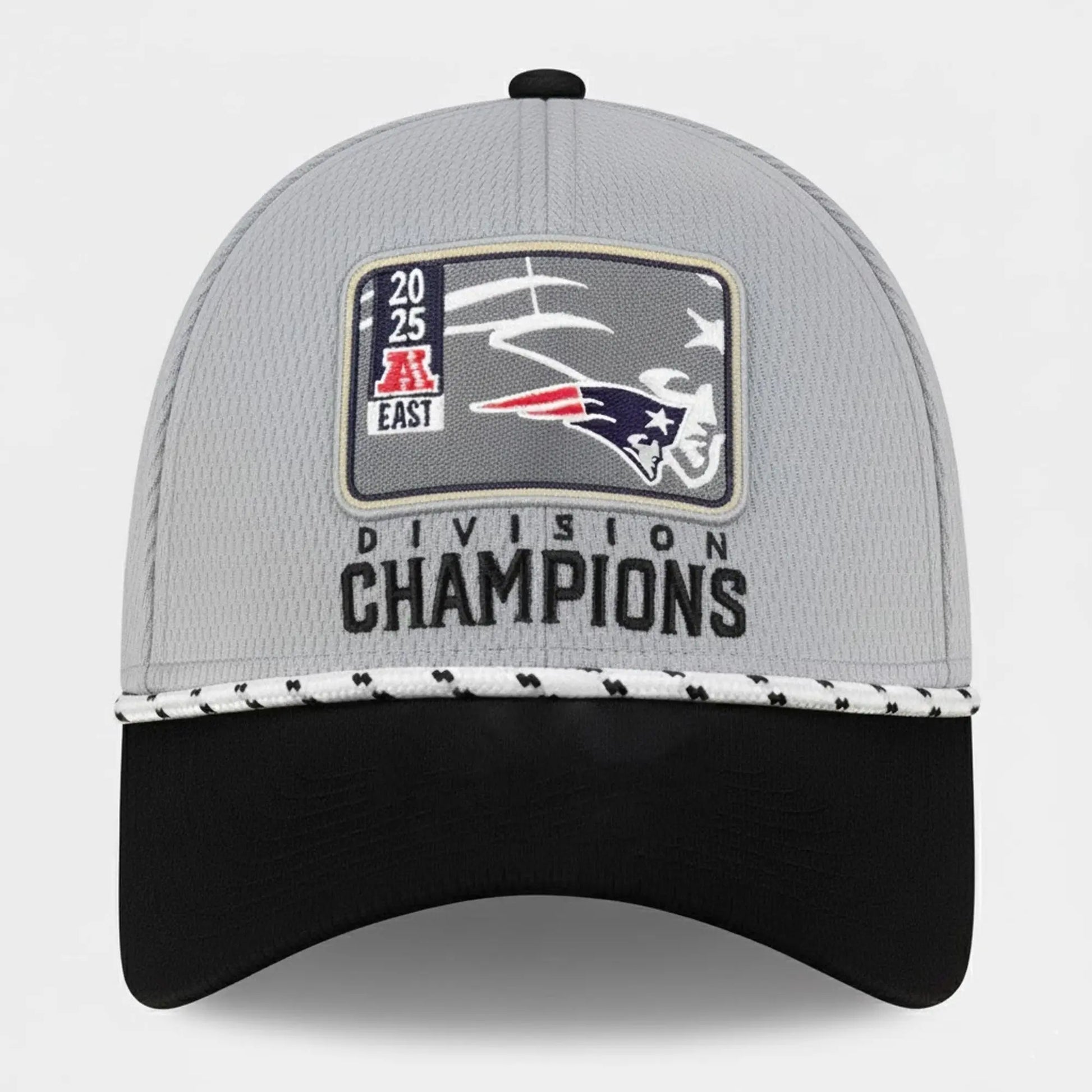 The Patriots 2025 AFC East Division Champions Hat triumph and unyielding team spirit, featuring a sleek heathered gray crown with a sharp black brim, accented by intricate rope trim for a premium, modern edge. At its heart lies a bold embroidered patch proclaiming "2025 AFC EAST DIVISION CHAMPIONS" flanked by the iconic flying Elvis logo in vibrant red, white, and navy, alongside the AFC emblem—capturing the exact moment New England reclaimed divisional dominance. This adjustable-style hat isn't just headwear; it's a wearable badge of resilience and pride, inspiring fans to channel the Patriots' victorious energy in everyday life, from tailgates to street style, fostering unity, optimism, and the thrill of championship glory.