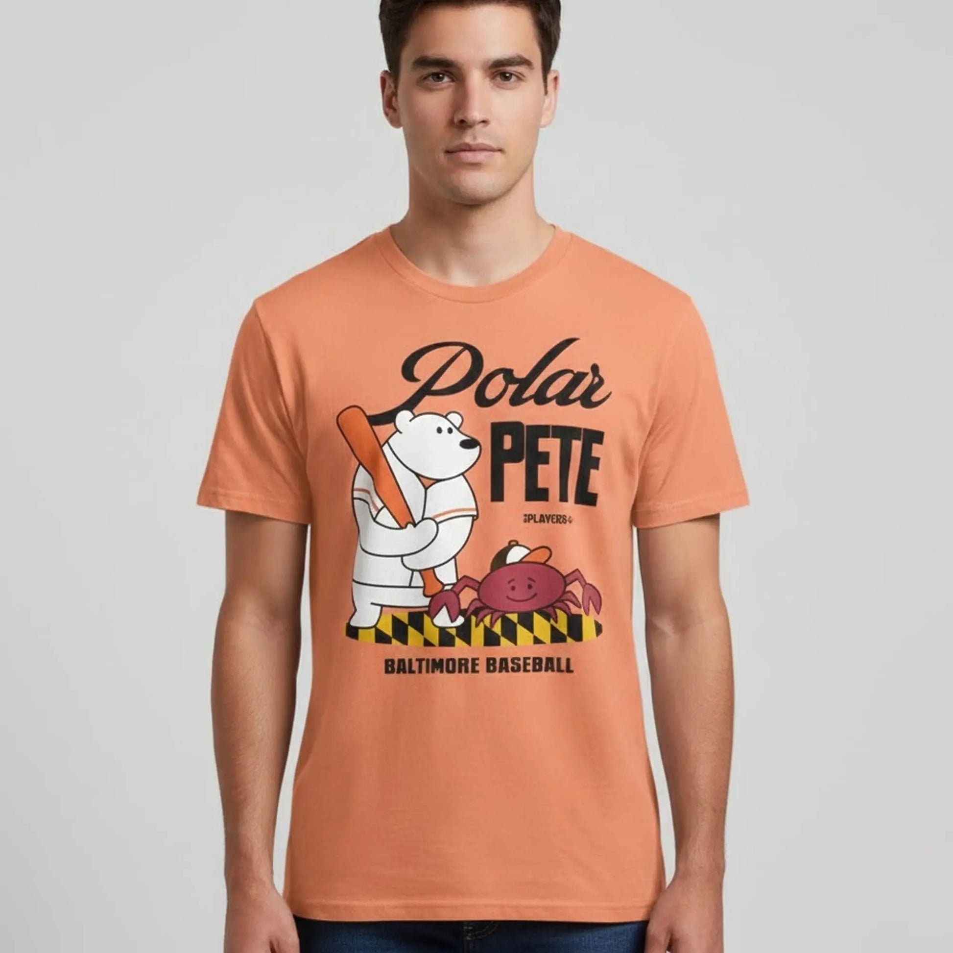 This Polar Pete Players Baltimore Baseball shirt features a friendly polar bear holding a baseball bat beside a smiling crab, set above a pattern inspired by Baltimore and Maryland colors, creating a fun and eye-catching design. The bright orange background gives the shirt an energetic, optimistic feel, making it perfect for game days, casual outings, or hanging out with friends. Its positive imagery celebrates teamwork, local pride, and the joy of sports, reminding the wearer to stay playful, determined, and connected to community spirit.