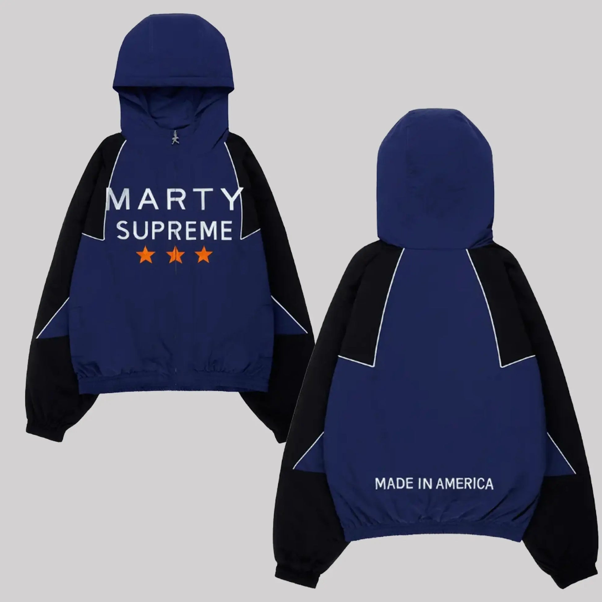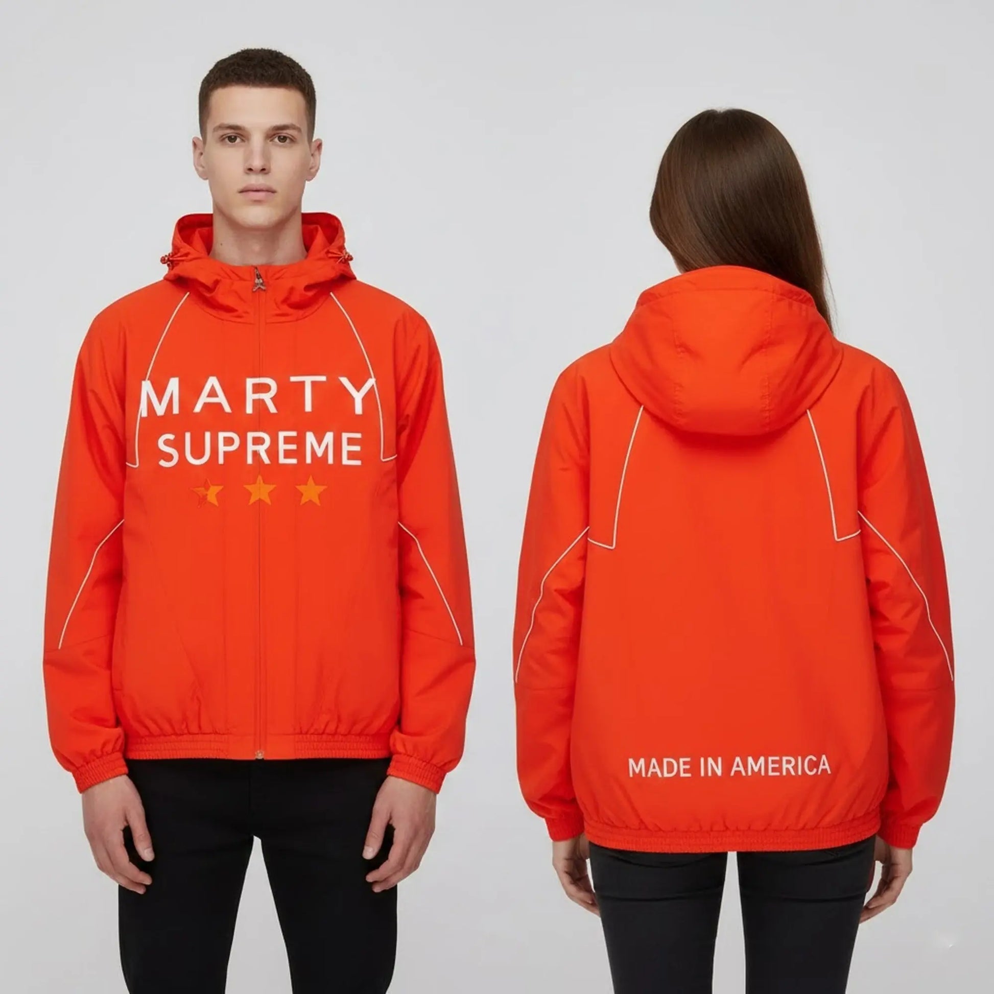 When Ringo Starr wears the black Marty Supreme Jacket, the bold “MARTY SUPREME” lettering and three bright orange stars across the chest give him a youthful, optimistic energy that contrasts warmly with his legendary status as a Beatle. The crisp white piping, sporty hood, and “MADE IN AMERICA” slogan on the back make the jacket feel like a celebration of creativity, resilience, and community spirit rather than just another piece of merch. In his post, the jacket amplifies his familiar message of peace and love by showing that he is still engaged with new art, new films, and a new generation, sending fans the positive message that staying curious and playful keeps you forever young. The jacket went viral because it sits at the perfect intersection of pop culture and fashion: a edition movie tie‑in, worn by an iconic musician, with graphics that are instantly recognizable and highly shareable in photos and clips across social platforms.